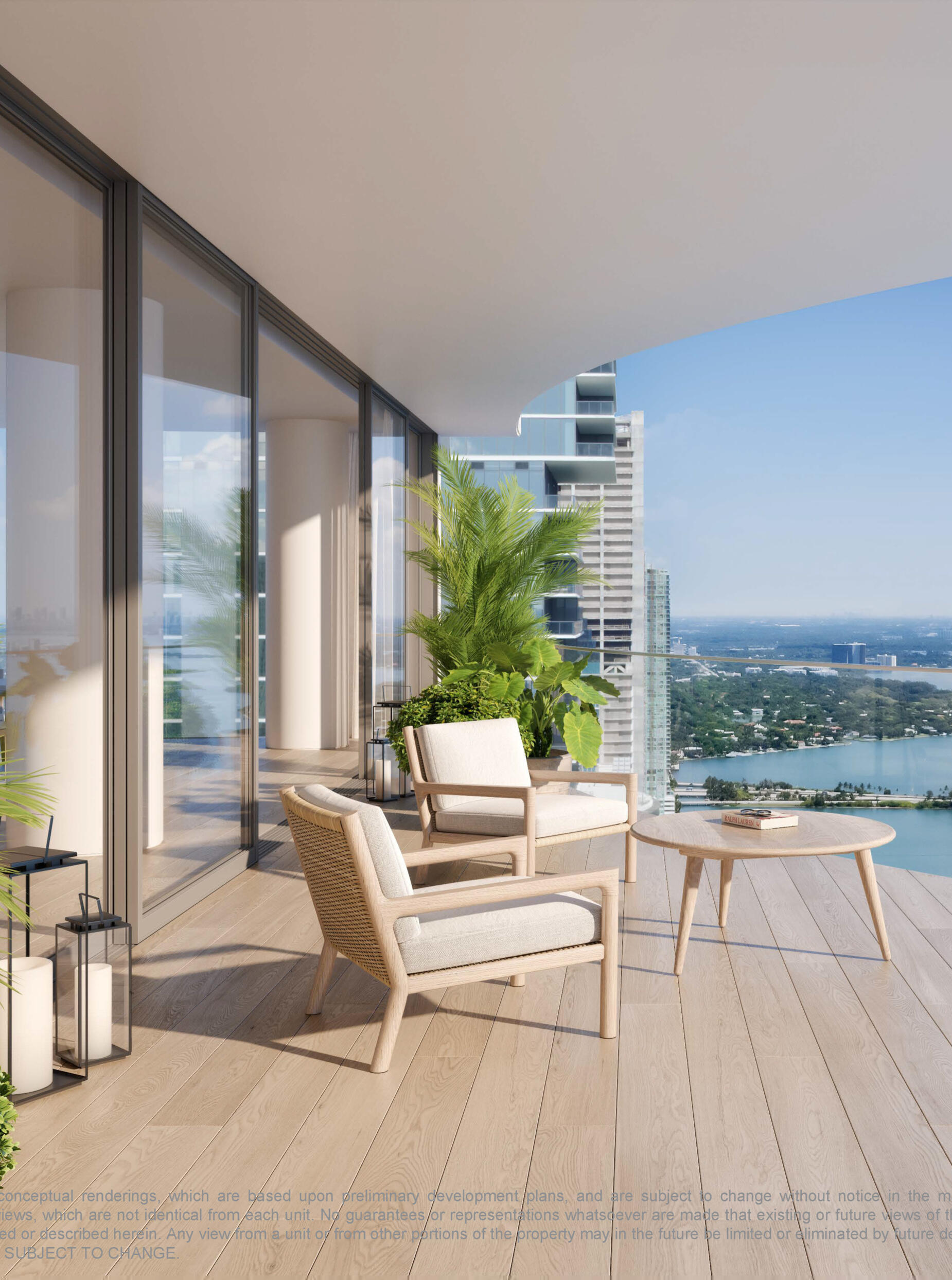 - One-, Two-, Three-, and Four-Bedroom Residences from 1,952 to 3,815 square feet- Semi-private elevators lead to Private Residential Foyer- Ceiling heights range from 10- to 14-feet- Up to 12-foot deep terraces with panoramic views of Biscayne Bay, Downtown Miami, Miami Beach, and the Atlantic Ocean- Floor-to-ceiling glass windows and sliding glass terrace doors